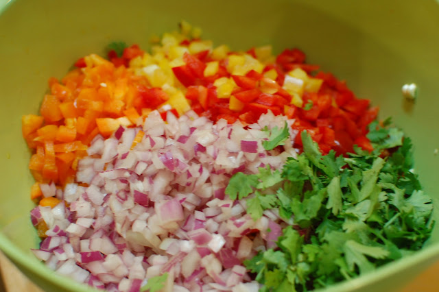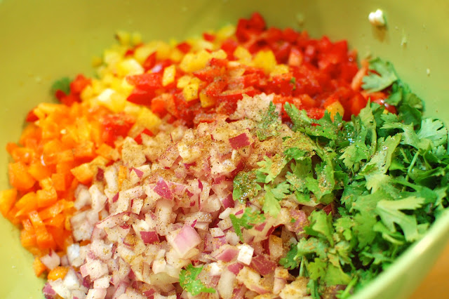 Dice up your favorite veggies! I used tomatoes, bell peppers, purple cabbage, onion and cilantro! You can also add black beans and/or avocado (just keep in mind that they can get mushy and don’t hold up as well if you are planning to eat this the next day). Spice it up with some fresh diced jalapeno’s if you so choose!