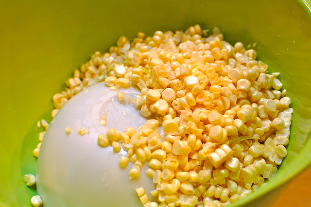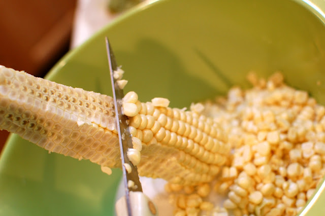 First, cut a bunch of your favorite corn off the cob (I don’t even bother cooking it…I like sweet corn nice and raw)!