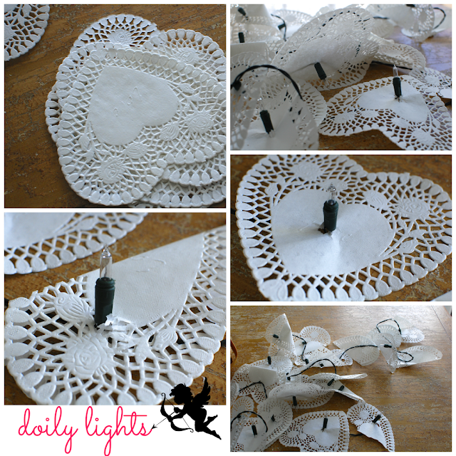 Isn’t this doily string of lights fun? I recently saw THIS idea on Pinterest and decided to try it myself. If I had an all-white strand of lights around I would have used it…but I didn’t and I still think it turned out great!