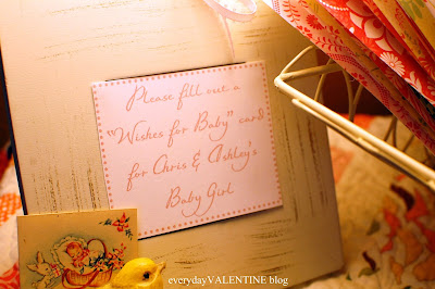 I have a few vintage baby cards that we pinned up on some twine with clothes-pins, along with some baby pictures of the mommy & daddy, around the room.