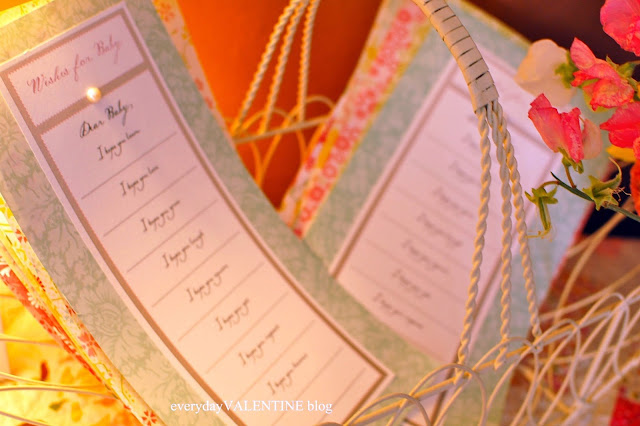 Each person at the shower filled out a {Wishes for Baby} card that we gave her later in a cute box.I made my own template but my sister found the idea on Pinterest {so there are several ways to do-it-yourself}.