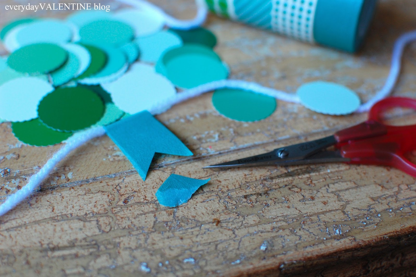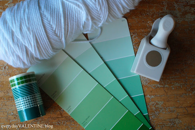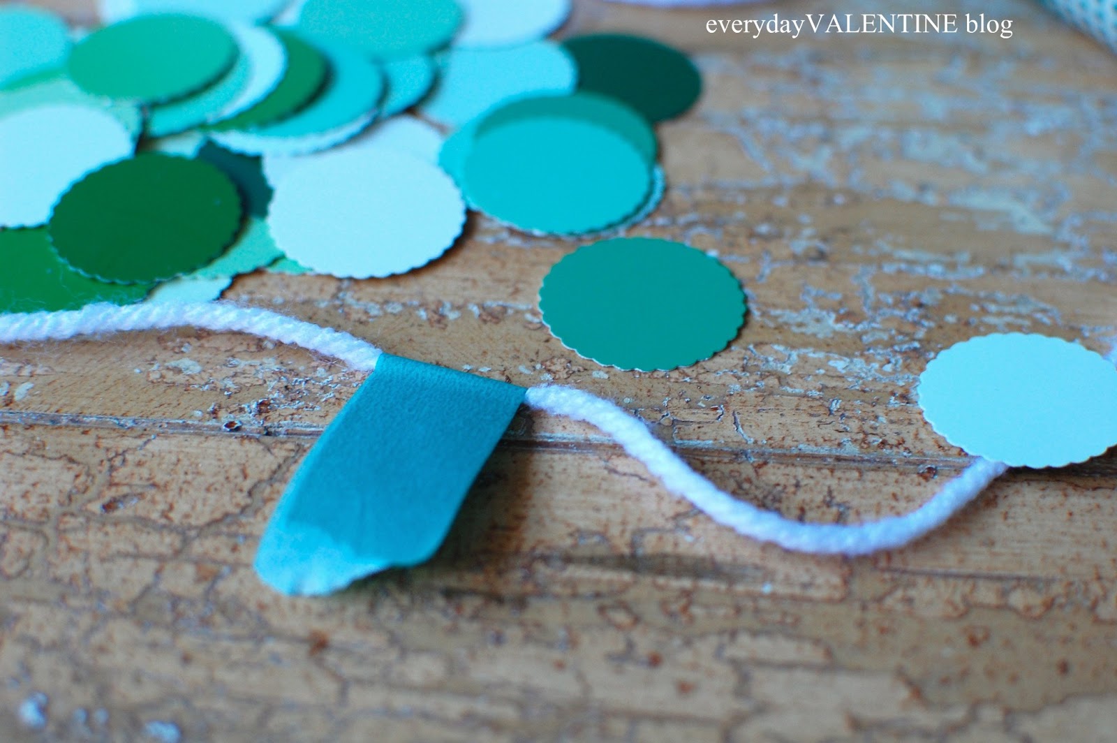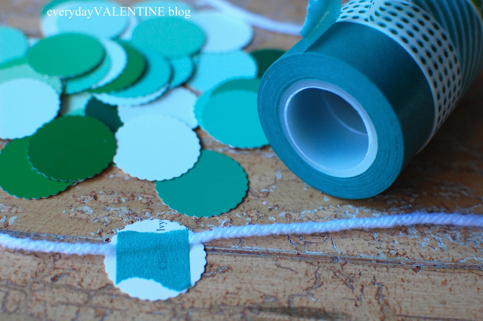 attach paint chip circles to yarn with washi tape {i alternated my green colors but you can do all the same or an exact pattern if you prefer}