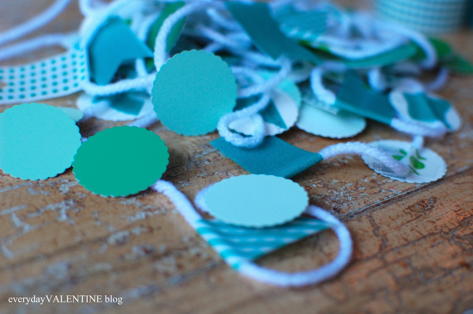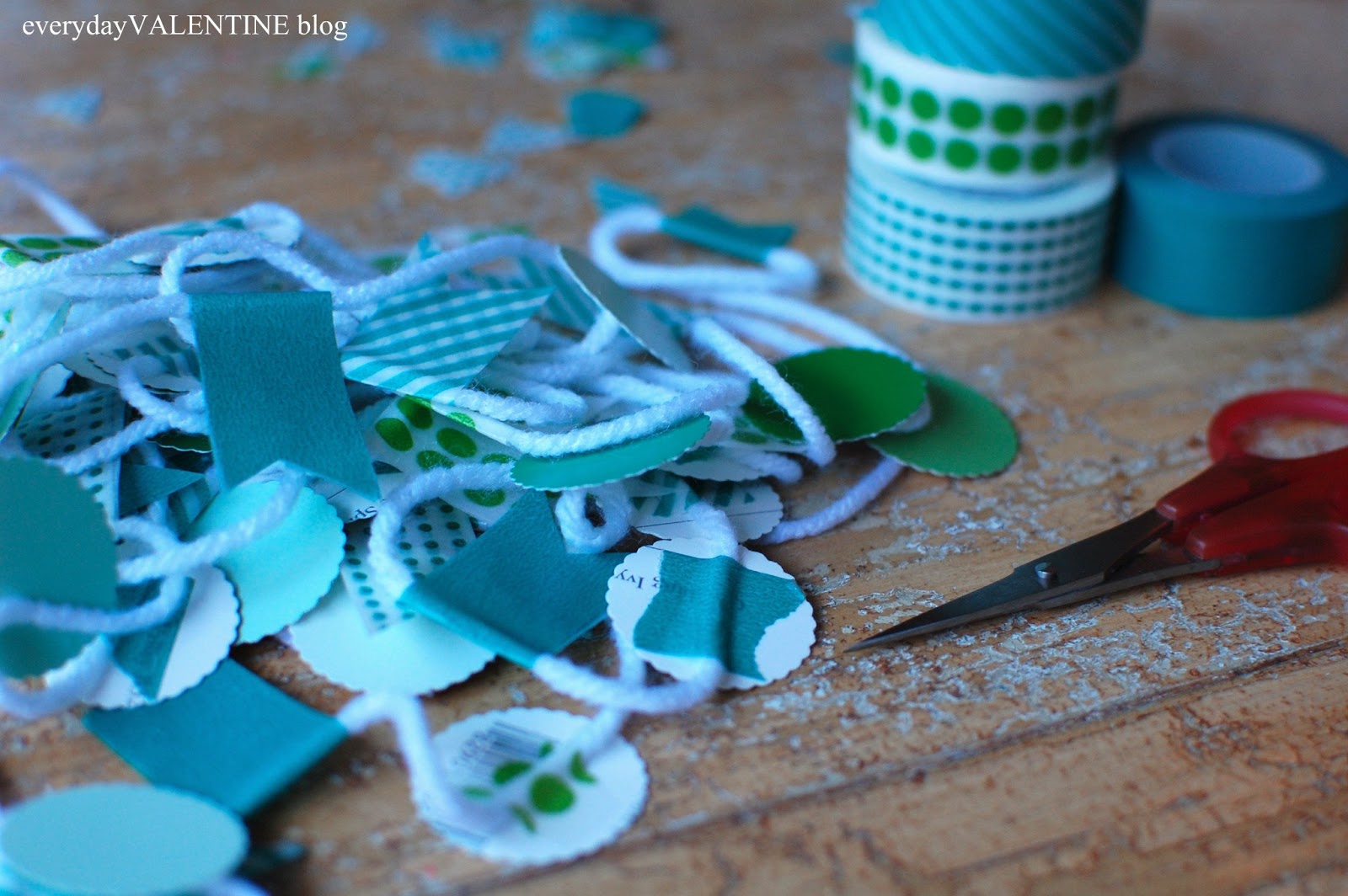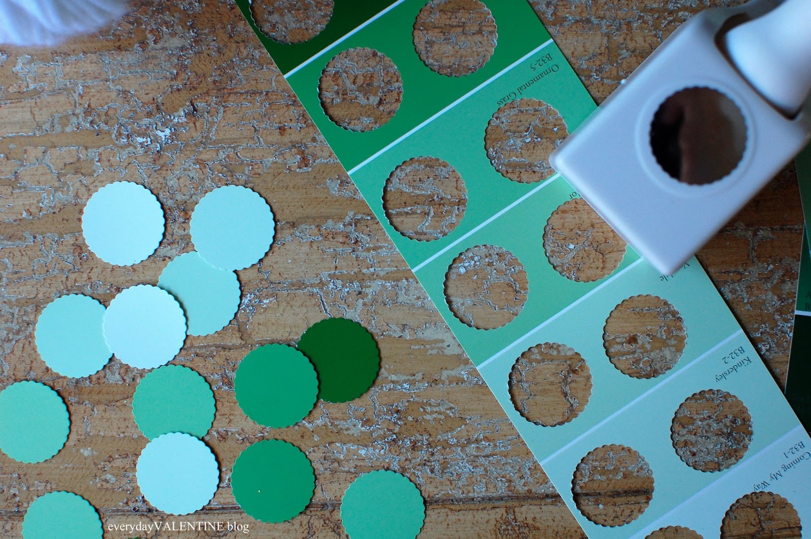 attach paint chip circles to yarn with washi tape {i alternated my green colors but you can do all the same or an exact pattern if you prefer}