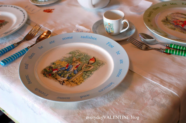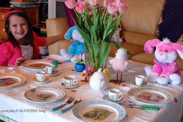 We had a lovely Easter Tea for the kids last weekend. My fabulous sister-n-law makes the most amazing food. She can cook, bake and comes up with great party menus. She made everything you see here from scratch! Amazing! My mother-in-law has lovely taste, lots of vintage dishes and found these adorable Peter Rabbit plates for the kids. Paige helped her decorate this little table {her Lalaloopsy doll even got to join us} and I got to help in the kitchen {something I always love to do when Auntie Shannon is cooking}! Check out the menu and some links below. It was tasty and fun! The perfect combo for any tea party!