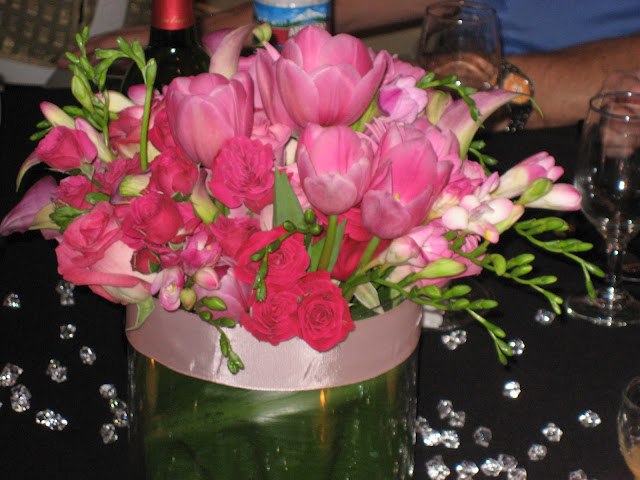 With all that in mind I got to help decorate for her party several years ago. We used lots of black linens, nice stem-wear {rented} and tons of jewels {diamond inspired}. Kim {my cousin and June’s granddaughter} is amazing with flower arrangements {see below} so we did those ourselves. We knew pink flowers and sparkly accents would be the perfect addition to the black backdrop. We moved furniture out of their main living area and added beautifully decorated tables under displays of white lanterns that we hung from the ceiling {with thumb tacks}! Aunt Ev had a meal of June’s favorite foods catered and we gave a few roasts and toasts for the lucky lady. Birthday cake was shared along with a slideshow that I made of pictures from the 80 years of her life! Kim and I also made a small scrapbook of pictures we loved of June from over the years {it include slots for small slips of paper that each guest signed and we later included in the book}. She loved it. She passed it around for weeks, bringing it around with her to bridge, her hairdresser and other friends homes.