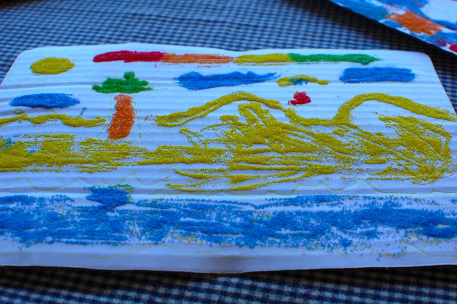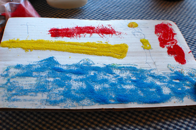 Last summer when the kids were all together she came up with this little project to use up leftover sand from a kit for making sand art in a bottle {pictured below}. It was simple…but the kids loved it. They each drew out pictures on cardboard {with a pencil or crayon} and then used the popsicle sticks to add glue to each desired area. Next they sprinkled the colored sand on the glued area of choice and shook it off {like cinnamon toast}!