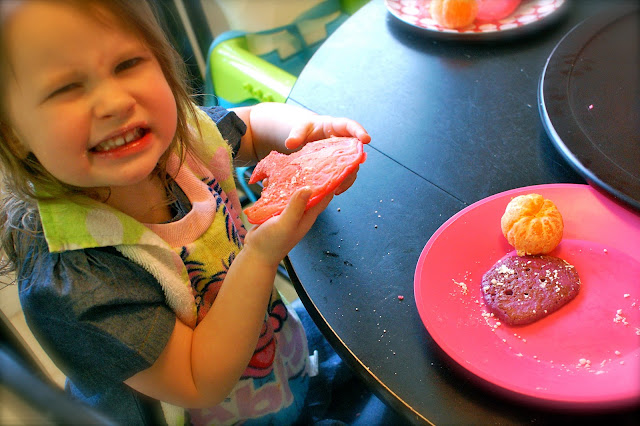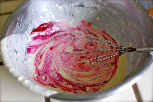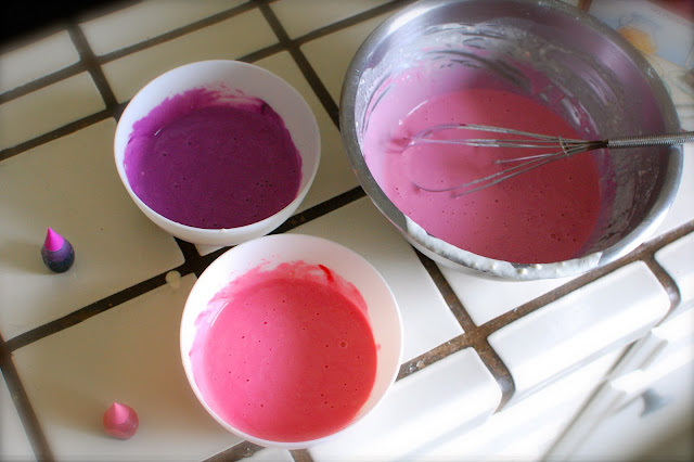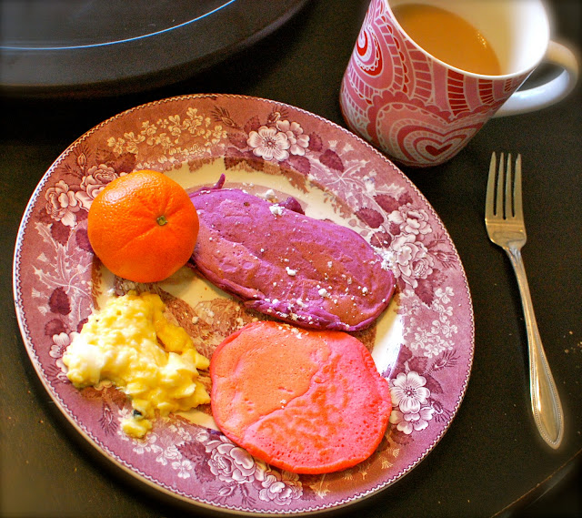 So I have been seeing cute rainbow pancakes on the blogs lately…so I decided to make some pink and purple pancakes because Paige loves pink and it’s a great time of year since it is almost Valentine’s Day…Right!?